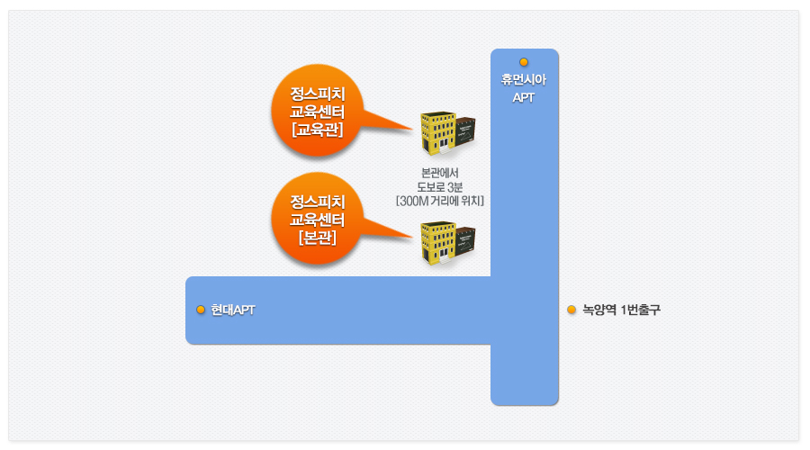 녹양역 (1호선) 1번출구로 나오시면 정면건물 5층에 위치한 [정스피치 교육센터]가 로고와 함께 보입니다.